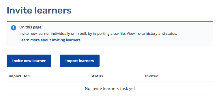 To add learners one at a time, click Invite new learner and fill in the required fields (email, first name and last name). Consider including a Group Name to allow you to filter learners in groups.